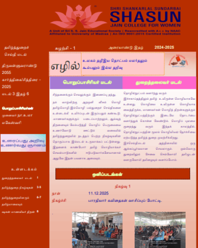 The Department of Tamil has produced exemplary results and so far the pass percentage has always been 95% and above. The faculty members are involved in triggering passion towards literary creativity among the students. The Department stands unique in having conducted PPT competition in Tamil. 18 E-magazine issues have been released from the Academic year 2015 to the Academic year 2021-2022. Currently the Department has released the Newsletter instead of E -magazine in the Academic Year 2022 – 2023. The Department provides ample opportunities for students to know the value of Life.