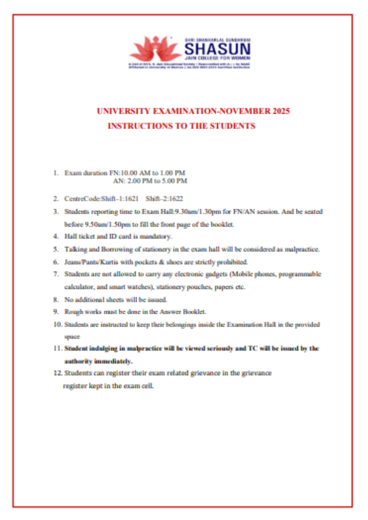 University Semester Practical & Theory Exams happen in the month of October & November (Odd semester) and March & April (Even semester). Semester exams are conducted as per the Madras University’s time table & guidelines.