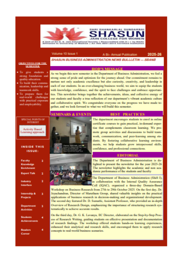 The Department of Business Administration was established in the year 2005. We have a total strength of 210 students and 5 faculty members. Our predominant vision is to be in the center of excellence in the field of management at par with other institutions and empower our students through value-based holistic education.
