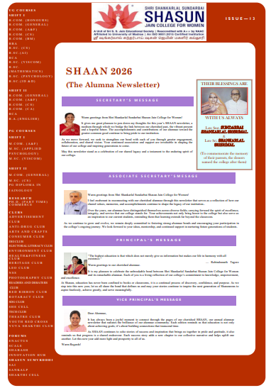 Established on 18.01.2019, Shasun Alumni Association creates and maintains a life-long connection between the Institution and its alumni, whose number is more than 15,000. In collaboration with extremely dedicated office bearers, the Alumni Association works to connect alumni, support students, and build an unforgettable Institution experience through a diversity of events, programming, and services. The Alumnae Association consists of 20 members. The executive members are Ms. T.V.Gowthami- President , Ms.R.Nithya – Secretary, Ms.M.Haritha- Treasurer. The first and second Annual Alumnae General body meeting of the office bearers was held on 21- 09-2019 & 23-01-2020 respectively.